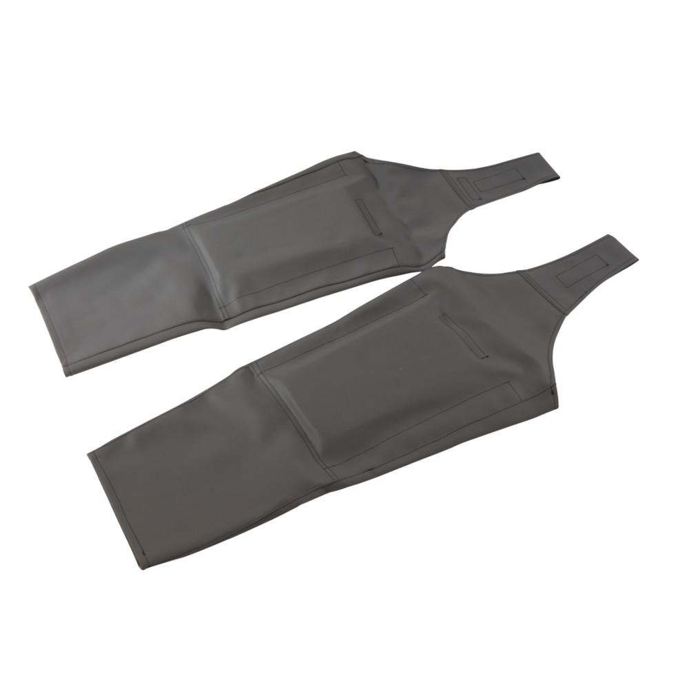 Stabiles Kunstleder, 100 % wasserfest und extrem abriebfest gegen Estrich, Cromat und Zement, mit dicken, großen Knie-Polstern aus Zellkautschuk, die austauschbar und nachrüstbar sind. Estrich Druckknöpfen lassen jede Bewegung zu.